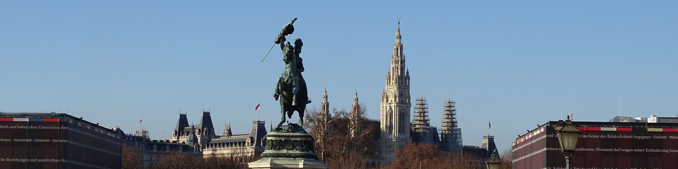 Als Ausdruck kaiserlicher Macht sollte ein Kaiserforum von gigantischen Ausmaßen entstehen. Der Generalplan des deutschen Architekten Gottfried Semper sah vor, die Hofburg mit den barocken Hofsstallungen (dem heutigen Museumsquartier) zu verbinden. Zwei sich spiegelbildlich gegenüberstehende Flügel der Hofburg und zwei sich ebenso gegenüberstehende Museen für die kaiserlichen Sammlungen sollten das Forum quer zur Ringstraße begrenzen. 20 Jahre nach Baubeginn erfolgte 1891 die feierliche Eröffnung der beiden Museen, das ambitionierte Gesamtprojekt des Kaiserforums blieb aber ein Torso. Zeitgleich entstand in unmittelbarer Nähe das Rathaus als Symbol bürgerlicher Repräsentation. In Kombination mit einem der Hofburg zugewandten, monumentalen Bürgerforum, dem heutigen Rathausplatz, sollte es die kaiserliche Residenz in den Schatten stellen. |